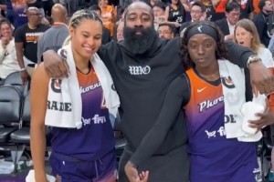 本场比赛,快船球星詹姆斯-哈登现身场边观战,赛后他还与水星球员萨巴利和库珀拥抱庆祝。