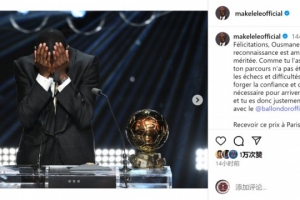 体育资讯9月24日讯 法国足坛名宿马克莱莱更新社媒动态,祝贺登贝莱获得金球奖。