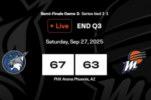 体育资讯9月27日讯 WNBA季后赛半决赛G3(大比分目前1比1),山猫对阵水星。