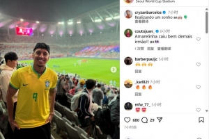 此役山东泰山外援克雷桑身穿自己名字的巴西9号球衣,现场见证了巴西的大胜。