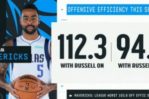 拉塞尔在场时独行侠进攻效率112.3,下场后为94.7;目前独行侠进攻效率103.8联盟垫底